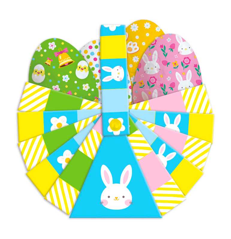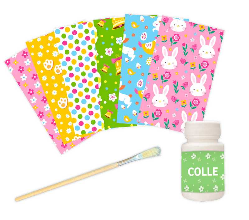 Un petit coffret cadeau à offrir sur la thématique de Pâques contenant 6 oeufs en polystyrène blanc à décorer gâce à 6 feuilles de papiers imprimés type Décopatch© de 6 motifs différents, 1 tube de colle, 1 pinceau, 1 pas à pas et 1 patron en papier pour fabriquer et assembler un petit panier à fermer avec 2 attaches parisiennes. Une fois les décorations des oeufs finalisées et le panier réalisé, les enfants pourront y glisser leurs 6 beaux oeufs de Pâques !