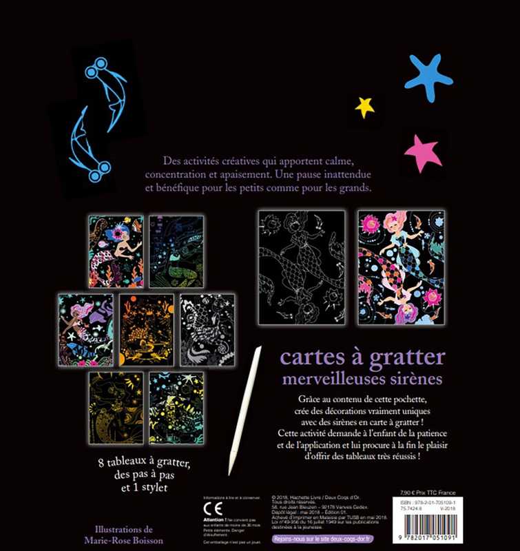 Une pochette contenant 8 cartes à gratter grâce à des modèles et des pas à pas et un stylet en bois. Grâce au stylet, en grattant les cartes, l'enfant révèle de superbes effets.