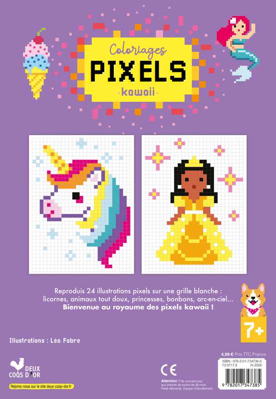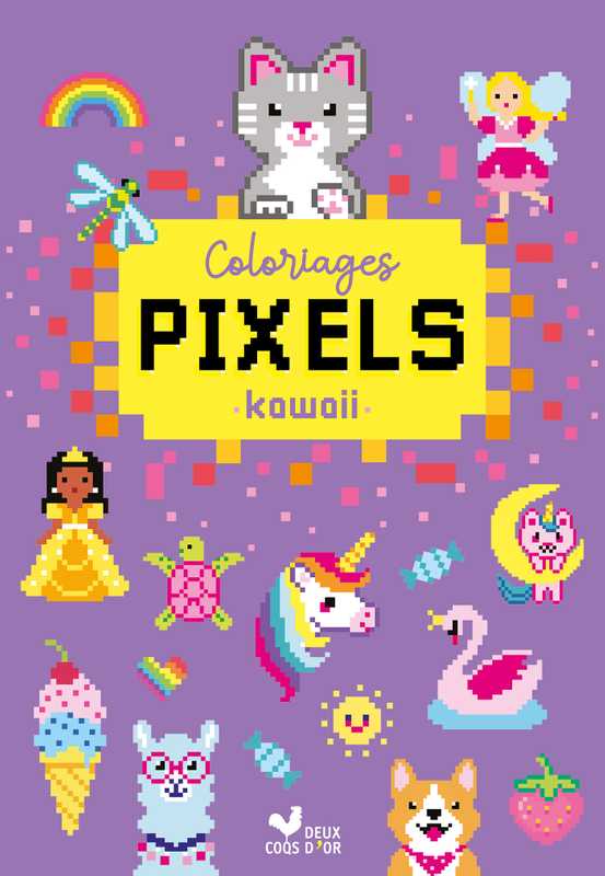 Un bloc de 24 coloriages sur la thématique des pixels kawaii qui développent l'imaginaire et le goût de la couleur et favorisent le calme et l'application des enfants. L'enfant est invité à reproduire 24 illustrations pixels sur une grille blanche : licornes, cupcake, sirène, chatons, arc-en-ciel...