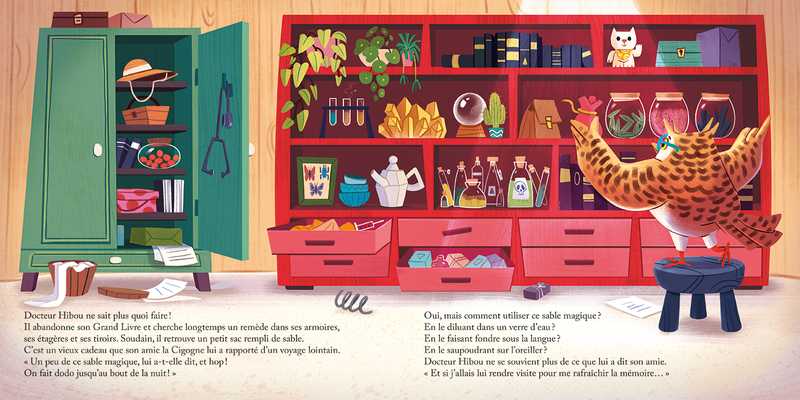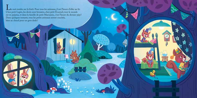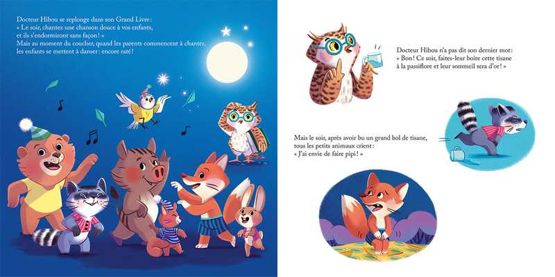 La nuit est tombée sur la forêt. Il est l'heure d'aller au lit ! Chez Petit lapin, les dents sont brossées, chez Petit écureuil, tout le monde est en pyjama, dans la famille de Petit marcassin, c'est l'heure du dernier petit pipi... Oui, mais voilà, depuis quelques jours, il se passe quelque chose de tout à fait étrange, les petits ne trouvent plus le sommeil ! Alors les parents, épuisés, décident de consulter le docteur Hibou. Un peu de sable magique et hop, les petits feront dodo jusqu'au bout de la nuit ! Une histoire tendre et amusante pour aider les enfants à s'endormir.