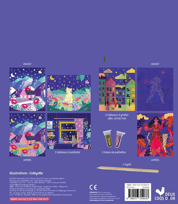 Les ateliers du calme : 10 ans de créations, 4 millions d'exemplaires vendus. Refonte de la collection en 2025 ! Une boite créative contenant 3 tableaux à décorer de paillettes et 2 tableaux transparents irisés à gratter dans une belle ambiance nocturne.