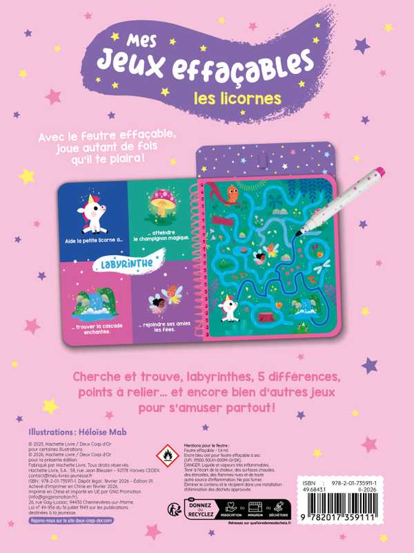 Avec le feutre effaçable, joue autant de fois qu'il te plaira ! Cherche et trouve, labyrinthes, 5 différences, points à relier... et encore bien d'autres jeux pour s'amuser partout !