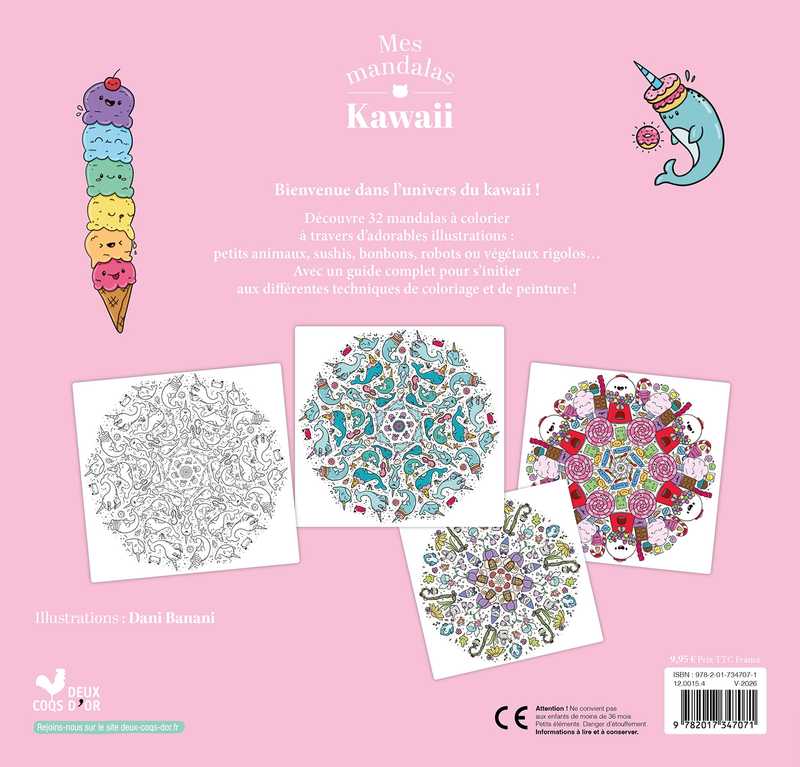 Un cahier souple de 80 pages avec 32 mandalas à colorier sur la thématique Kawaii, accompagnés de petits textes. Des illustrations adorables, joyeuses et très tendances autour de la gourmandise, des petits animaux kawaii (paresseux, lamas...), des végétaux rigolos et des créations mignonnes... des mandalas, cute, ludiques et joyeux pour se détendre tout en coloriant. Avec des conseils pour s'initier aux différentes techniques de coloriages ou de peinture.