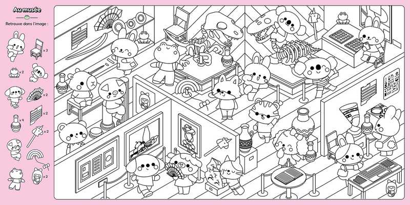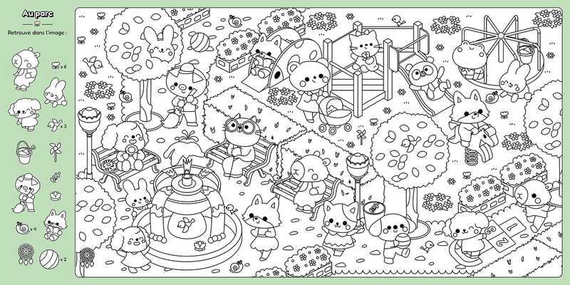 Un cahier de 64 pages 100 % cosy proposant 30 scènes de cherche & trouve à observer pour découvrir une quinzaine de personnages ou objets dans chacune, puis à colorier selon ses envies. 18 grandes scènes + 12 scènes en page simple. Des images très détaillées, drôles et affectives, dans un style kawaii. Toutes sortes d’animaux mignons sont représentés dans des scènes de la vie quotidienne, en ville : à vélo, en terrasse, au marché, dans une boutique de mode, chez le fleuriste, à la gare, au musée, etc.