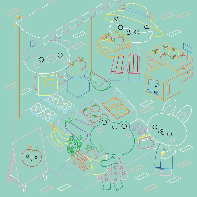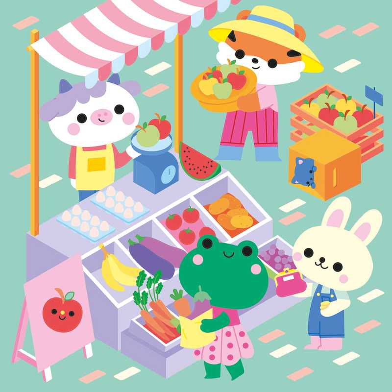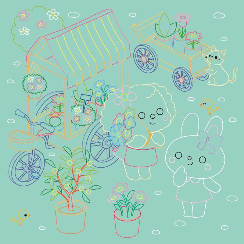 Une pochette proposant 5 tableaux à gratter, avec une encre pastel, sur la thématique du marché. Dans un style kawaii, chaque carte met en scène toutes sortes de petits animaux très mignons dans un décor de shopping en extérieur (stand de confiseries, de fruits et légumes, de bijoux ou encore de vêtements vintage). Le pas à pas illustré montre à l'enfant comment utiliser le stylet en bambou (fourni) pour révéler les dessins cachés.