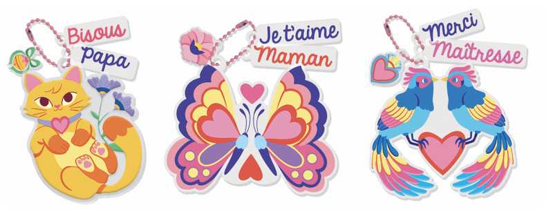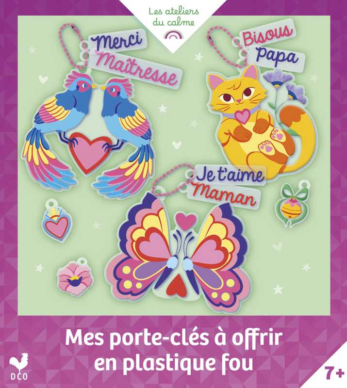 Contenu : 4 planches prédécoupées de plastique fou à colorier ; 3 chaînettes ; 1 pas à pas avec les modèles : 1 porte-clés chat à offrir à papa avec son message bisous ; 1 porte-clés oiseaux à offrir à sa maîtresse avec son message merci ; 1 porte-clés à offrir à sa maman avec son message Je t'aime.