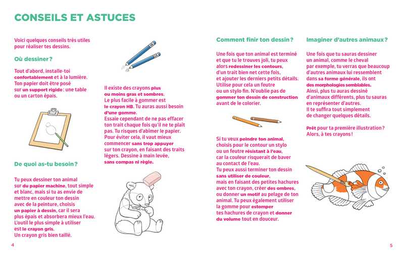 Un livre de 20 pas-à-pas pour dessiner en quelques coups de crayon tous les animaux les plus mignons, 5 crayons de couleurs, 1 crayon de papier, 1 gomme, et 1 bloc de croquis pour s'entraîner à réaliser tes plus beaux animaux.